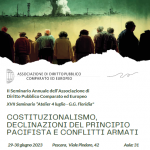 Nelle giornate del 29 e del 30 giugno 2023 si terrà il II Seminario annuale dell’Associazione di Diritto Pubblico Comparato ed Europeo, sul tema “Costituzionalismo, declinazioni del principio pacifista e conflitti armati”. L’evento, organizzato dall’Università degli Studi “Gabriele d’Annunzio”, insieme all’Università Telematica “Leonardo da Vinci”, all’Università degli Studi di Teramo e all’Università degli Studi dell’Aquila, si terrà presso il Dipartimento di Scienze Giuridiche e Sociali, nel Campus di Pescara della “d’Annunzio” ed avrà inizio alle ore 14.30 del 29 giugno. L’evento, che potrà essere seguito anche online, vedrà la partecipazione di 6 Rettori, 23 tra relatori e coordinatori di sessioni e 55 interventi nelle sessioni parallele di illustri studiosi di diritto pubblico comparato ma anche di altre discipline.