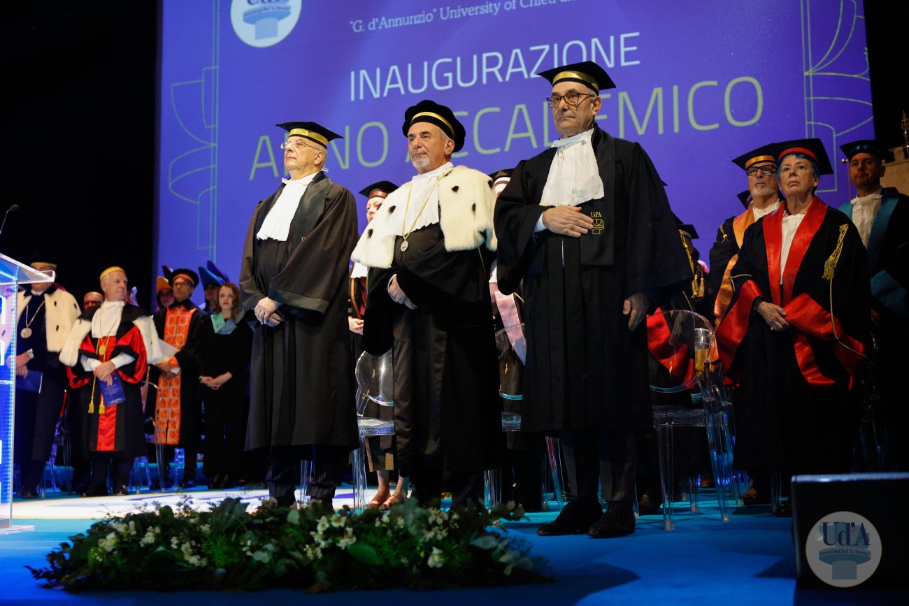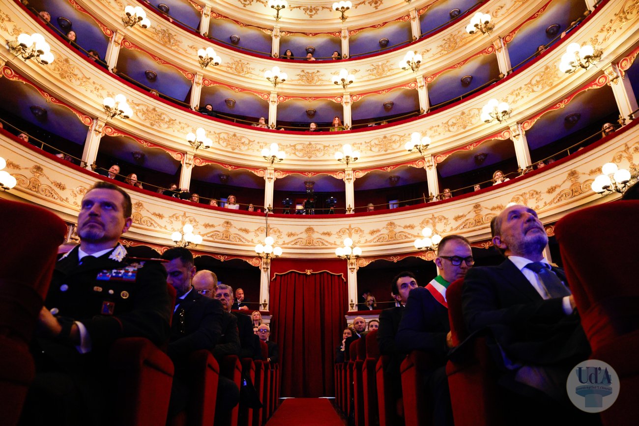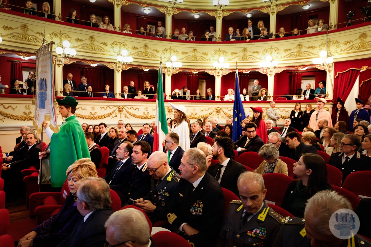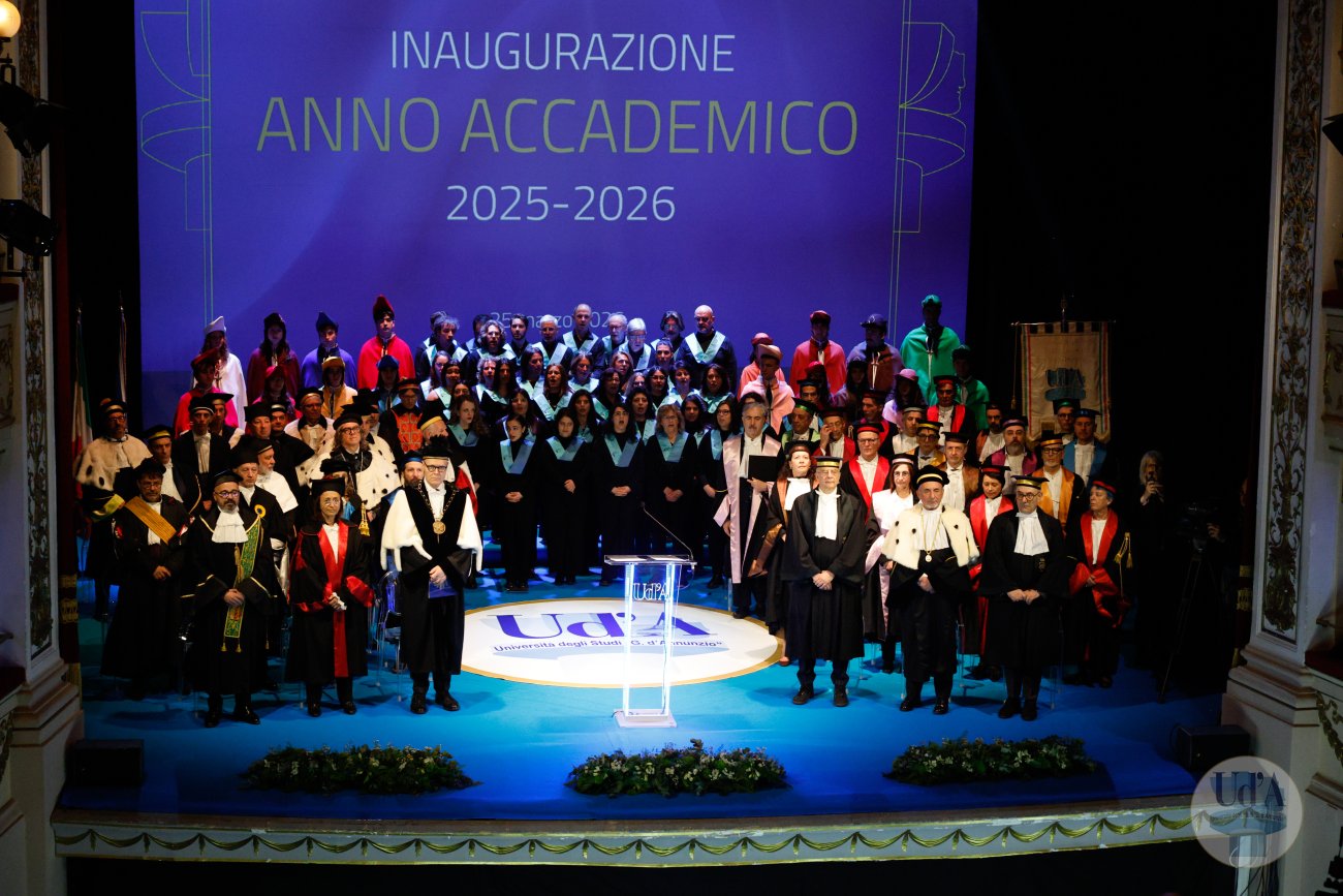 Teatro Marrucino - Chieti 25 marzo 2026, ore 11.00 La Cerimonia di Inaugurazione dell'Anno Accademico 2025/2026 si è tenuta il 25 marzo 2026, alle ore 11.00 presso il Teatro Marrucino di Chieti.Sono intervenuti il Magnifico Rettore Liborio Stuppia, il Direttore Generale Paolo Esposito, la Prof.ssa Lorella Martinelli in rappresentanza dei Docenti, il Dott. Glauco Conte per il Personale Amministrativo e Tecnico, il Sig. Basher Amuri in rappresentanza degli Studenti.Alla cerimonia ha partecipato il Presidente del Consiglio Nazionale delle Ricerche Andrea Lenzi.Il contributo musicale è stato curato dal Coro di Ateneo, UdA InCanto. Comunicato stampa Locandina Libretto Inaugurazione a.a. 25/26 Diretta facebook dell'evento Servizio RAI TGR Abruzzo Servizio di Rete8 Servizio di Super J Servizio video LAQTV Servizio di Tele Regione canale 17 Servizio di Telemax Servizio di TV6 Reportage - La "d'Annunzio" nel cuore del Sudan I momenti salienti della giornata Registrazione integrale della Cerimonia I momenti salienti della cerimonia