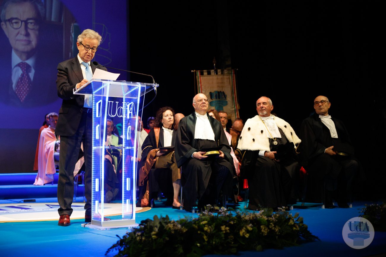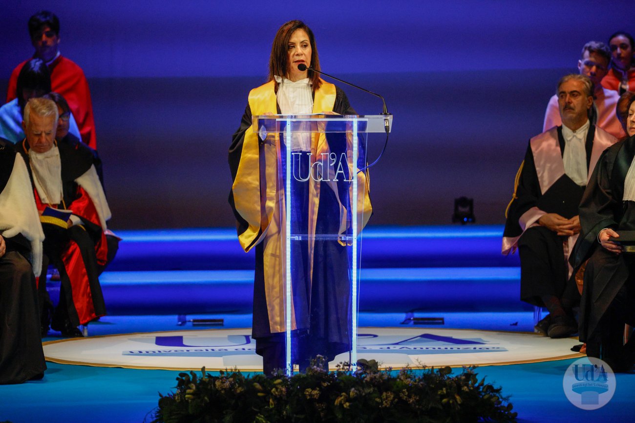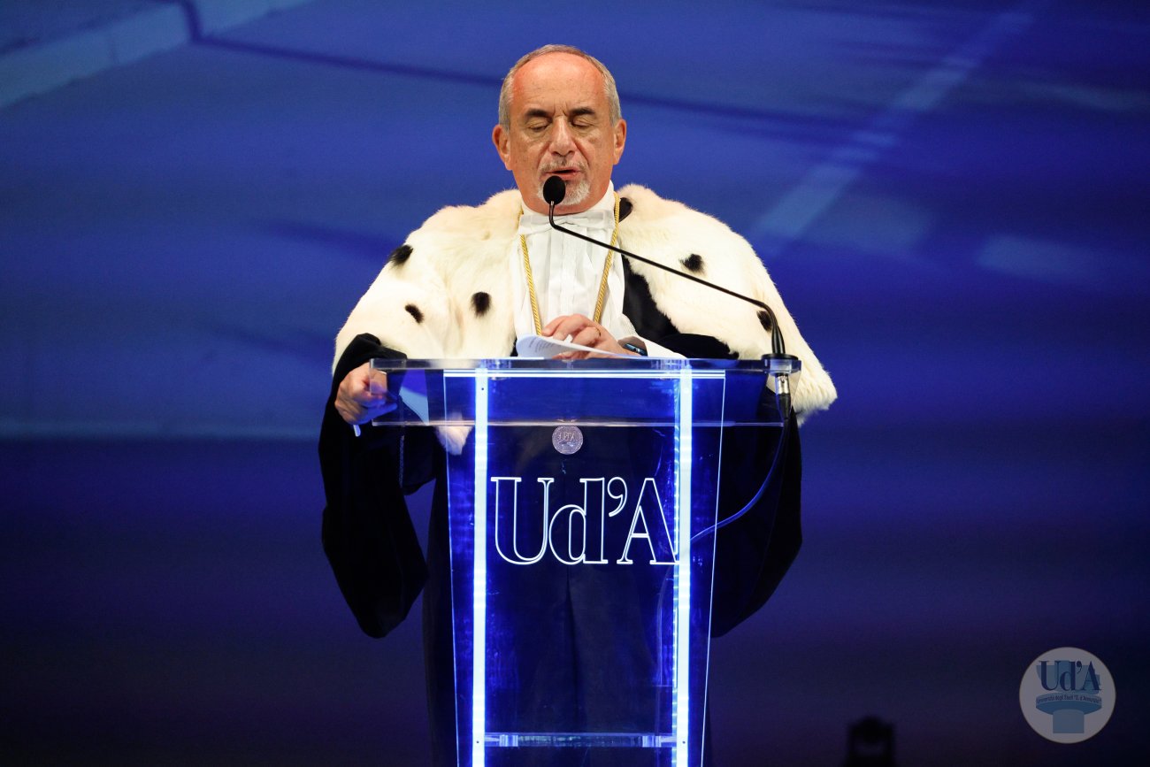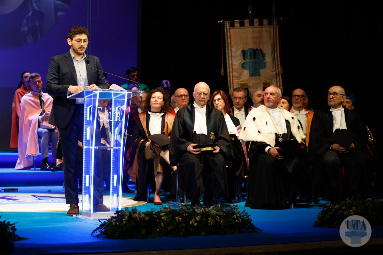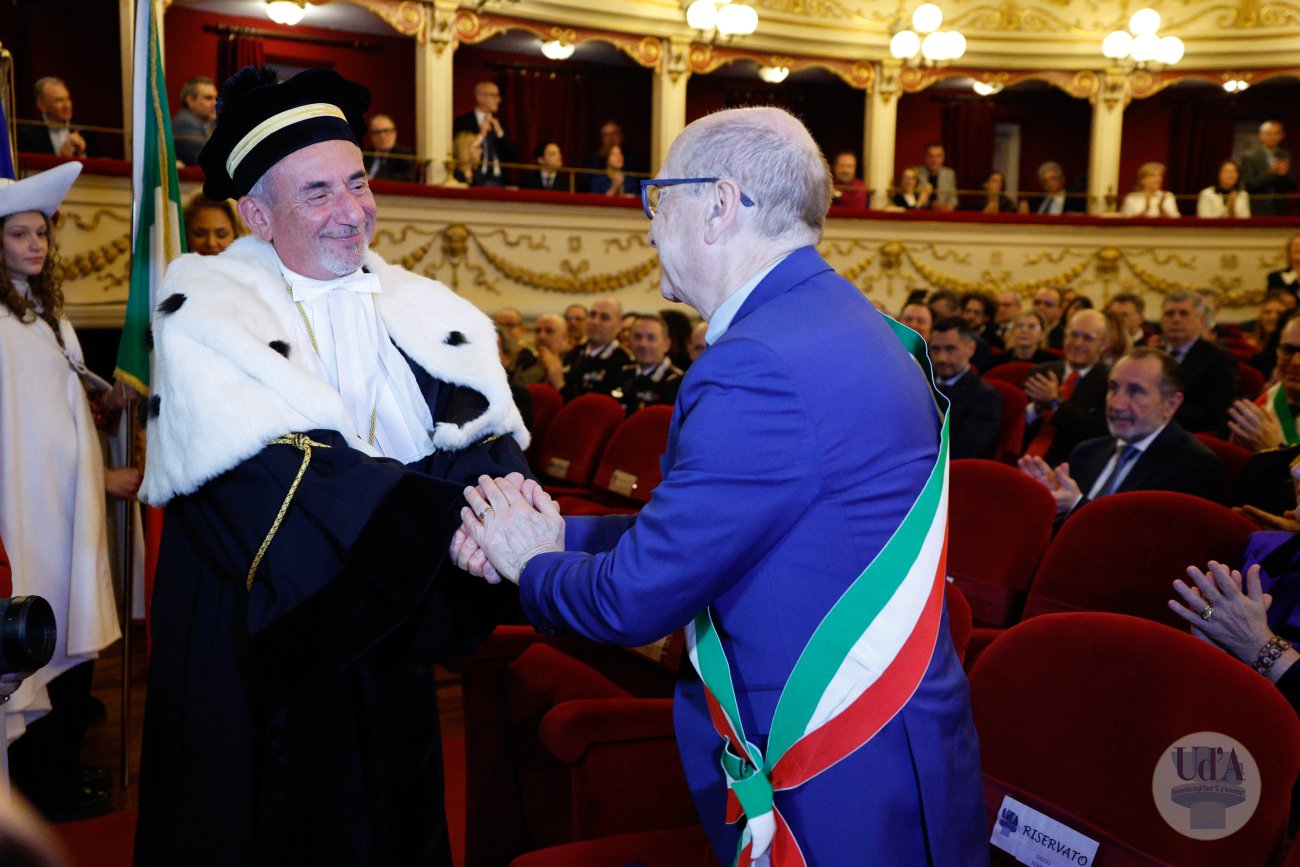Teatro Marrucino - Chieti 25 marzo 2026, ore 11.00 La Cerimonia di Inaugurazione dell'Anno Accademico 2025/2026 si è tenuta il 25 marzo 2026, alle ore 11.00 presso il Teatro Marrucino di Chieti.Sono intervenuti il Magnifico Rettore Liborio Stuppia, il Direttore Generale Paolo Esposito, la Prof.ssa Lorella Martinelli in rappresentanza dei Docenti, il Dott. Glauco Conte per il Personale Amministrativo e Tecnico, il Sig. Basher Amuri in rappresentanza degli Studenti.Alla cerimonia ha partecipato il Presidente del Consiglio Nazionale delle Ricerche Andrea Lenzi.Il contributo musicale è stato curato dal Coro di Ateneo, UdA InCanto. Comunicato stampa Locandina Libretto Inaugurazione a.a. 25/26 Diretta facebook dell'evento Servizio RAI TGR Abruzzo Servizio di Rete8 Servizio di Super J Servizio video LAQTV Servizio di Tele Regione canale 17 Servizio di Telemax Servizio di TV6 Reportage - La "d'Annunzio" nel cuore del Sudan I momenti salienti della giornata Registrazione integrale della Cerimonia I momenti salienti della cerimonia